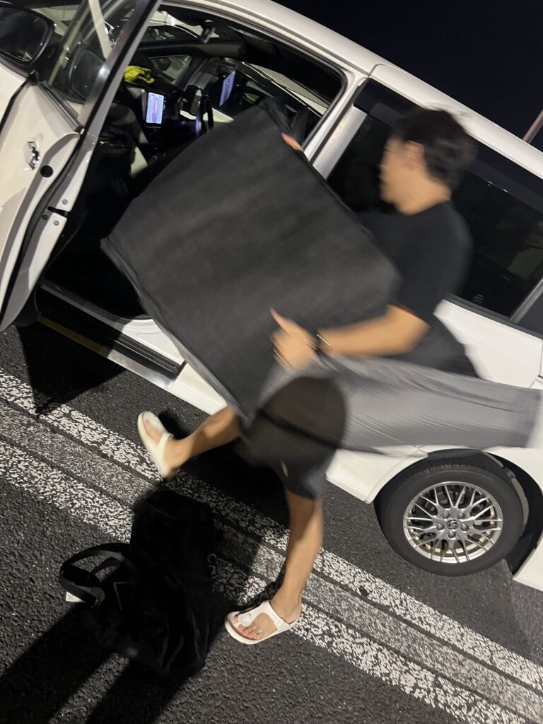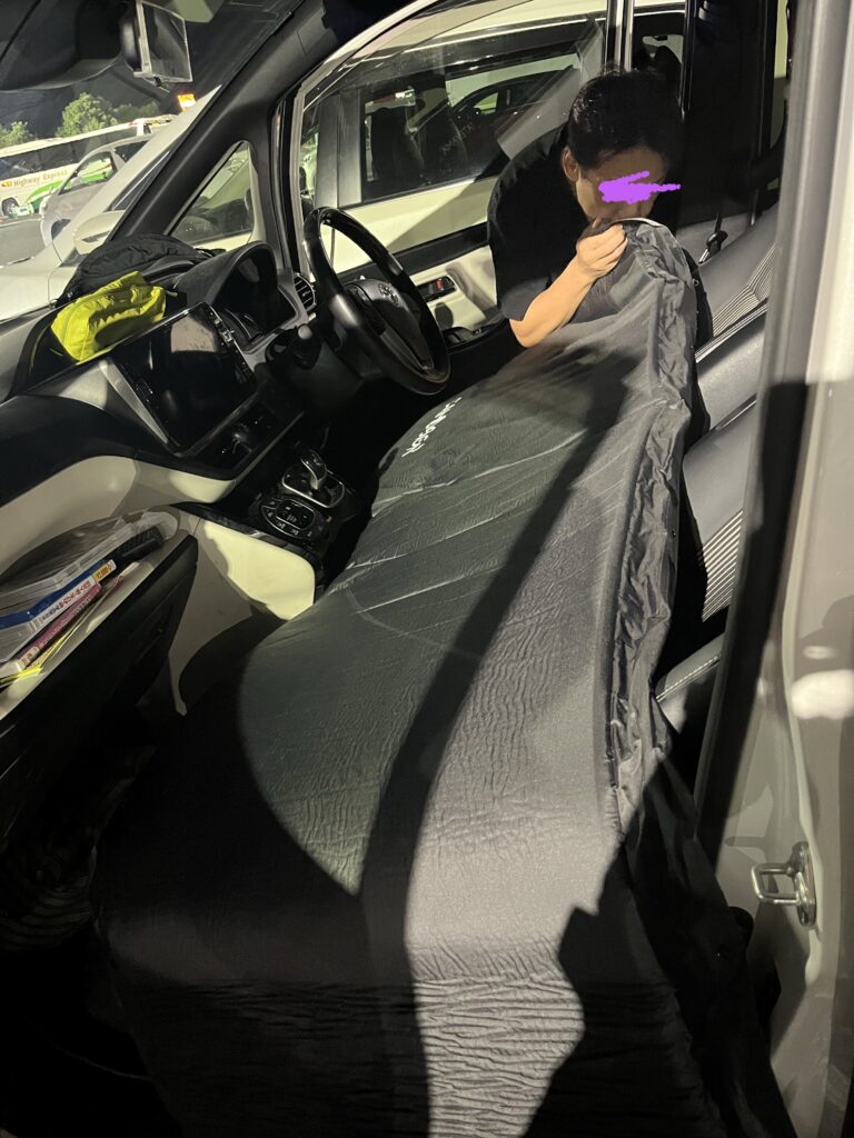 今回の車中泊用にAmazonで購入したエアーマットを、前部座席に敷き詰めてみる。