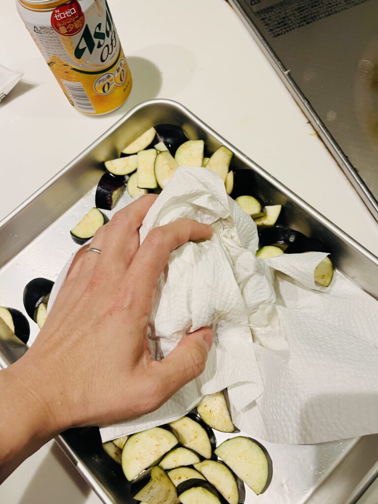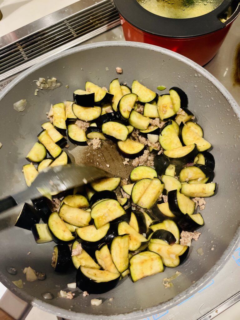 茄子は『絡み』をよくするため、少し薄めのくし切り。