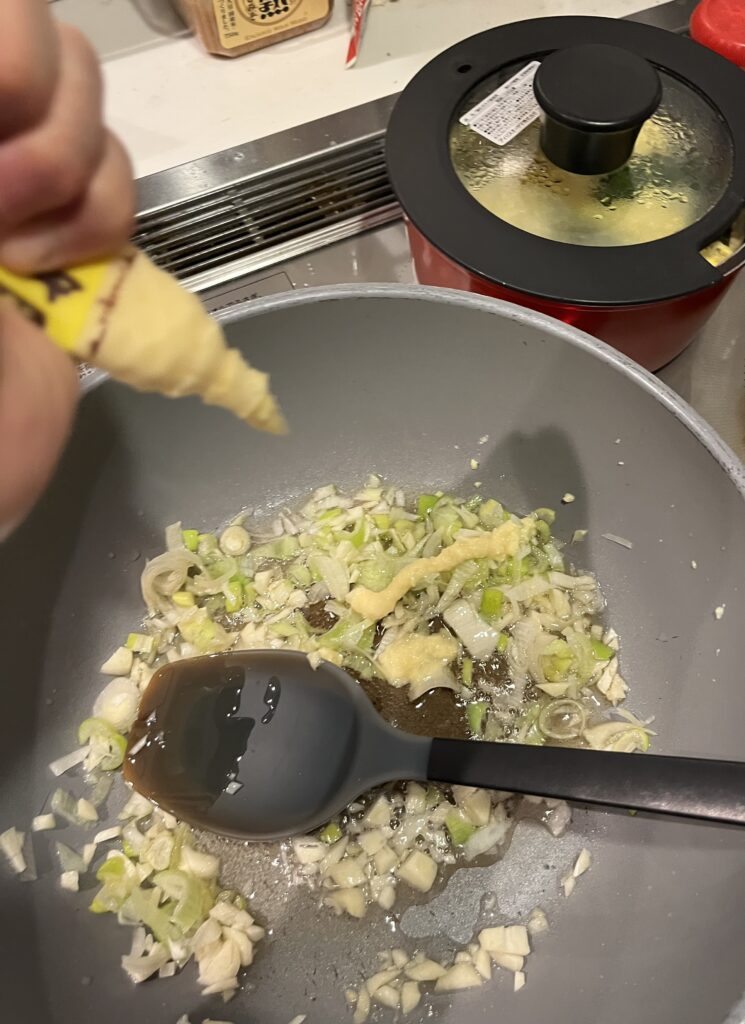 ごま油で、ニンニク、ネギを炒める。
