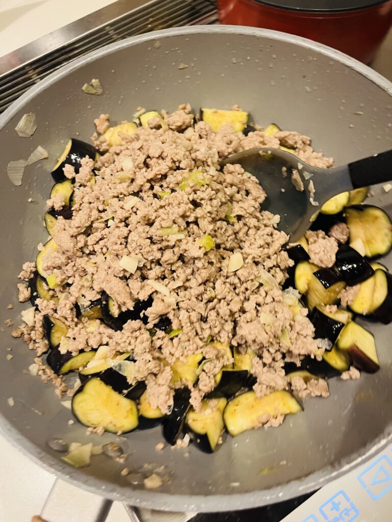 面倒臭がらずに一旦、ひき肉を取り出して、傷茄子を炒める。