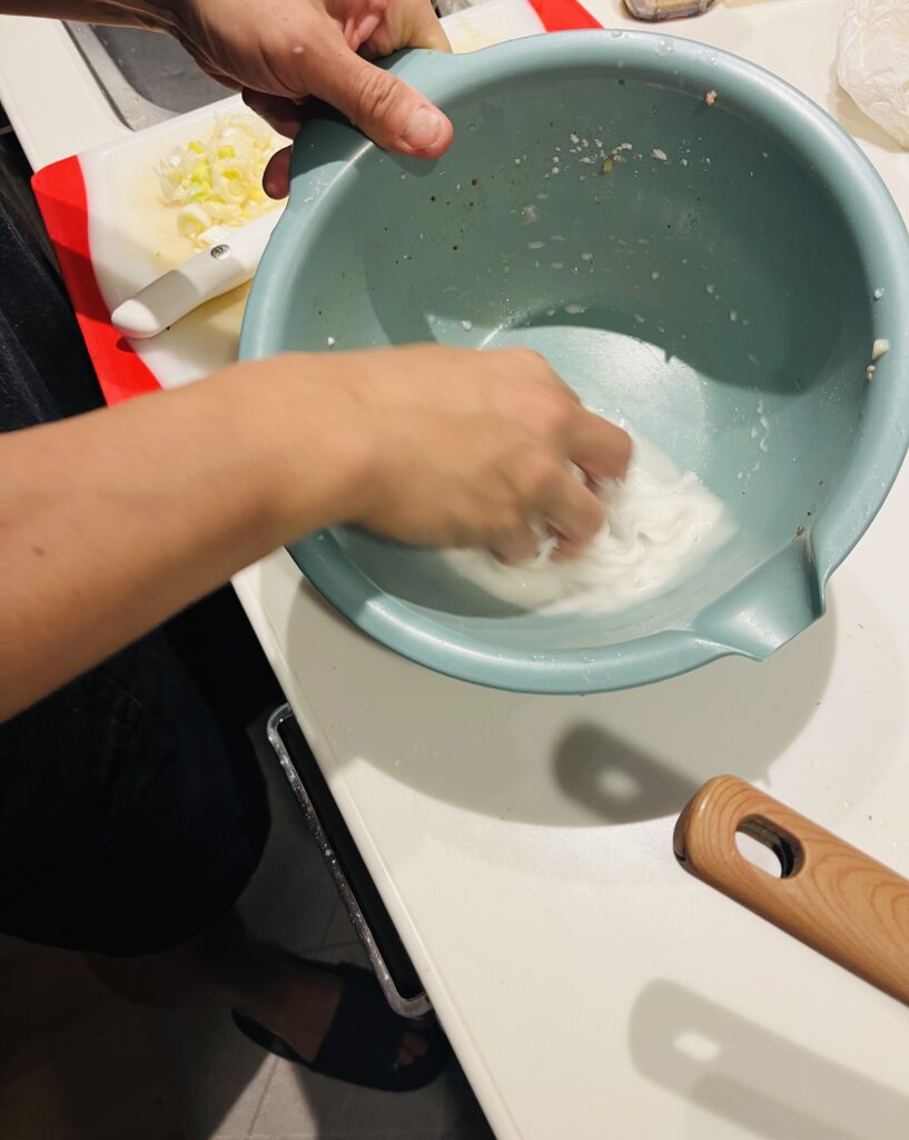 ボールが汚いのは先ほどのひき肉を取り出した後、洗ってないからです。