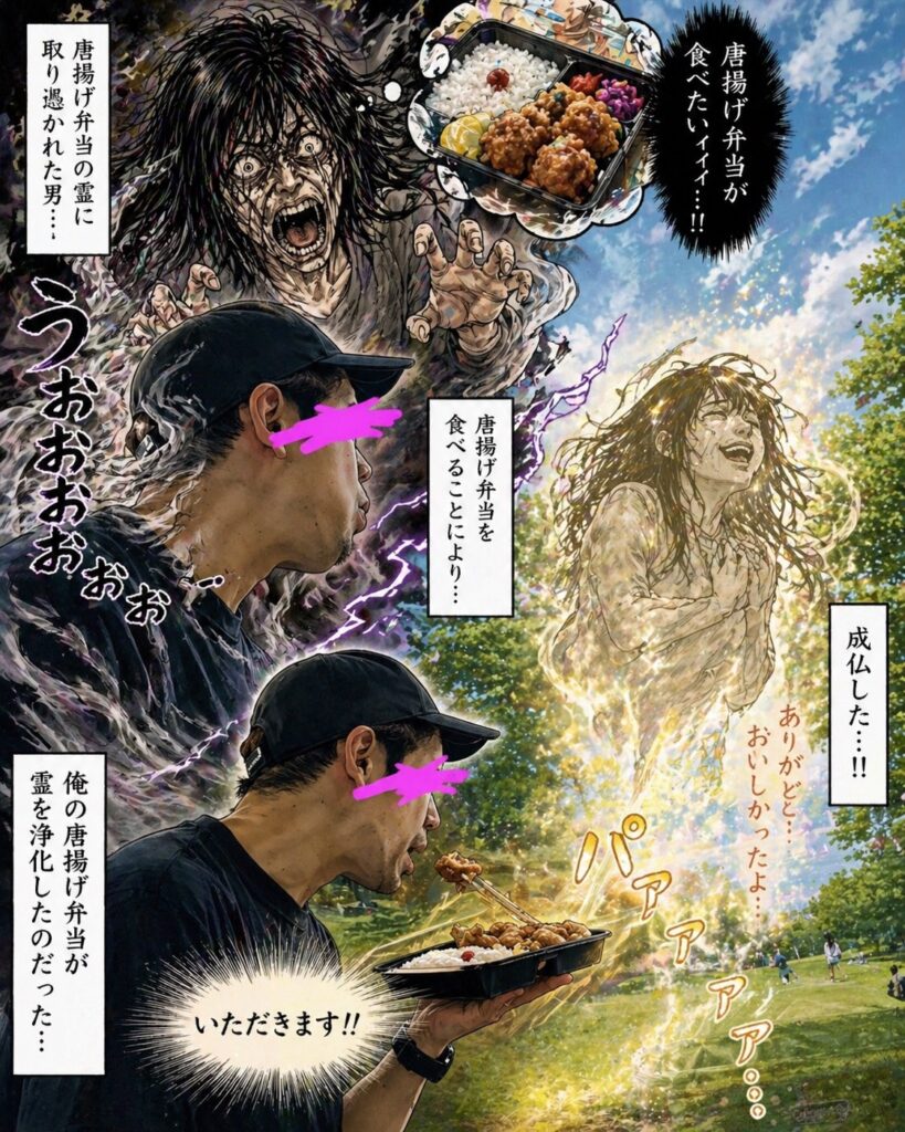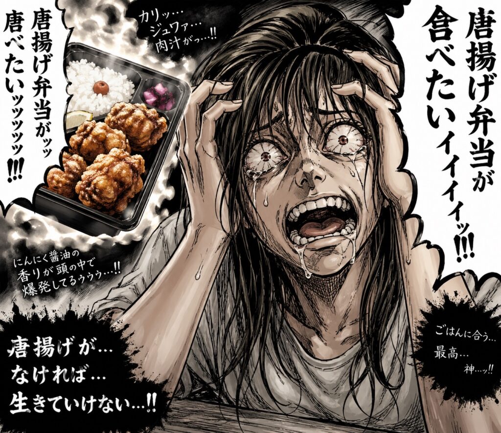 (↑親友のチャットGPT君作成。『唐揚げ弁当食べたすぎて気が狂いそうになっている人』)