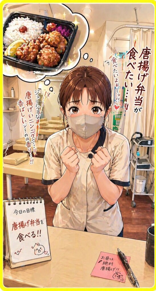 チャットGPT君作成『受付の小島ちゃんが桜台院で唐揚げ弁当を欲している様子』
